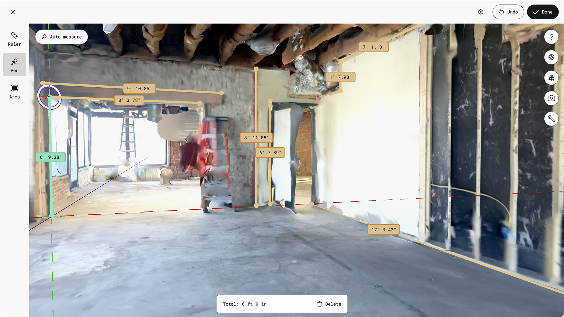 This speed also improves client interactions. "During an initial site walk-through, if a client asks about renovation costs for a specific area or the feasibility of design options, we can do a quick scan," Ellenbogen says. "Using Polycam's measurements, we can provide answers on area takeoffs or spatial constraints almost instantly, boosting client confidence."